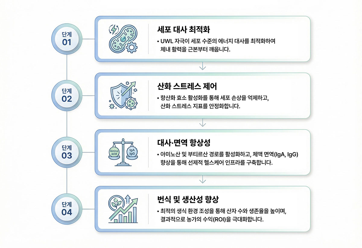 극미약광(UWL)은 세포 수준에서의 섬세한 생체 조절을 통해 대사 경로를 최적화하며,